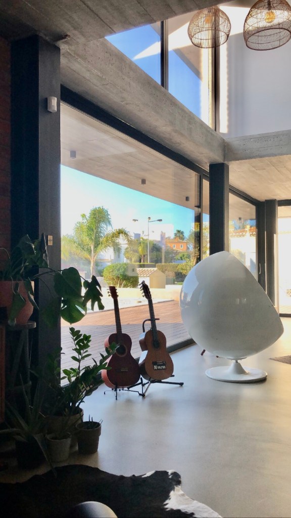 Our home in the Algarve, has what we would like to call an eclectic contemporary industrial look and feel. Nestled in an urbanisation that is comfortably quiet and peaceful, it is a 10 minute walk to the longest beach in Portugal called Meia Praia, a 15 minute walk to the Lagos Marina and 20 to the centre of the old town centre. Our design process when building this home was based heavily on how functional it would be for us, for our lifestyle. Every single nook and cranny has been built to suit our family’s needs. The kitchen is the heart of our home, where we entertain guests and gather as family. With an indoor outdoor style of living, the kitchen walks out into an outdoor dining, man kitchen and bbq area featuring our beloved Green Egg built into a bar on the one side and into the living room and study so that this was in one way a cohesive space where we could all be in the same area but have our own corner all at once. This is a great space to entertain since we have 300 days of sun here a year with a very thoughtfully built indoor-outdoor concept house. We knew we wanted several standout features in the architecture, hence the idea of the airwell and the floating stairs as well as the pool windows came into play. Because we love the Balinese concept of indoor to outdoor living, we conceptualised the house to be fully open with pocket sliding doors all around the living and kitchen areas. When the house is complete, it will feature five bedrooms, three baths, kitchen, outdoor kitchen and dining, living room, study, laundry room, powder room, man cave, garage, entertainment area, pool, an open concept kitchen outfitted with all SMEG appliances making up a total of 400sqmt.